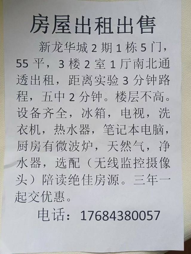 新龙华城 二期1栋5门303,55平,南北通透,俩室一厅。南屋北屋南屋,卫生间,厨房客厅最主要的是有天然气[呲牙]。租三年可以给安装空调。这小区不是谁家都有天然气的。实验中学3分钟,五中2分钟,育新小学3分钟的路程,”楼层不高3楼,路程不远正好,房东人好不唧唧。是陪读的绝佳房源,有意者看广告电话。